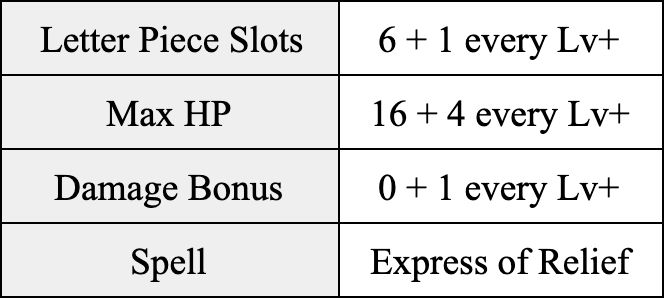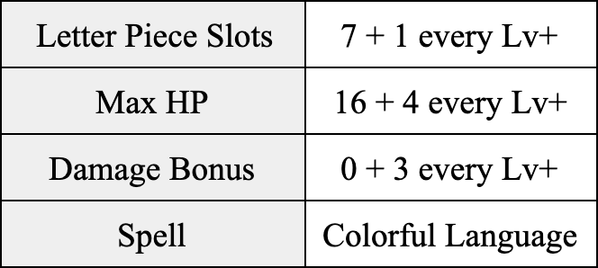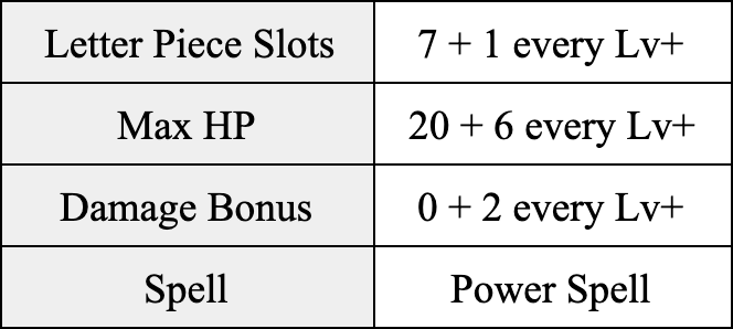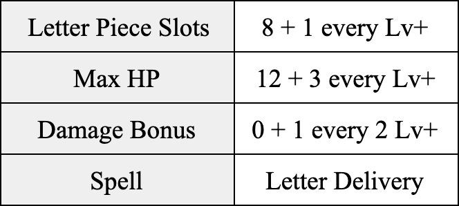Gram is the party’s source of wisdom and has access to a lot of letters. Gram can also cast a spell called Letter Delivery, which gives all party members bonus letters to use toward spelling a word, which do not count toward their inventory limit. The letters can also be used in between turns, meaning they are not required to be used in the same turn as when Gram casts the spell. The number of letters that Gram gives to each party member will depend on half of the word score that Gram earns from casting this spell. The final letter count granted from this spell is rounded down (floored) to a whole number.