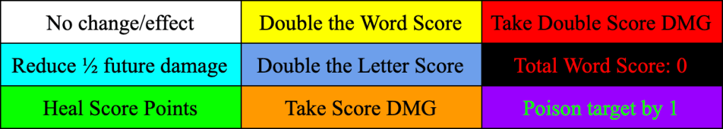 Some Letter Pieces can be color-coded which indicate some buffs or debuffs to each word caster. There are a total of 9 colors that letter pieces can have and are selected at random for each new Letter Piece. The table below outlines the effect that each colored Letter Piece brings to the player upon usage toward a word.